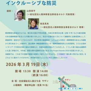 精神障害当事者会ポルケでは、防災についての取り組みを強化しています。2023年度に取り組んだアンケート調査では、認定NPO法人地域精神保健福祉機構(コンボ)さんに広報周知の協力をいただきました!事務局の秋山さんより、来月開催のこんぼ亭のご案内をいただきましたので、ご紹介をさせていただきます。