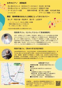 精神疾患の治療薬の副作用により、右手に障害をもった岡田秀子さん。「左手のピアニスト」として復帰し、「むすんでひらいて音楽事務所」を立ち上げ、片手でのピアノ演奏と、精神障害の理解を進める活動を行っています。左手で奏でられる演奏と、パートナーで熊本大学法学部教授の岡田行雄さんのお話が心に響く時間を、ぜひ共にしましょう。
