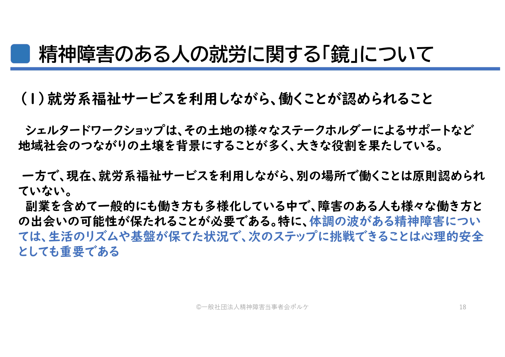 障害者権利条約を、目指すべき方向を示す「羅針盤」、社会の変化の進み具合を測る「物差し」、そして現状を映し出す「鏡」として位置づけ、理念と現実を往復しながら社会を変えていくための視点を提示しました。また、総括所見の内容を踏まえつつ、精神障害に関する就労支援の現状と課題についても私見を交えて報告しました。