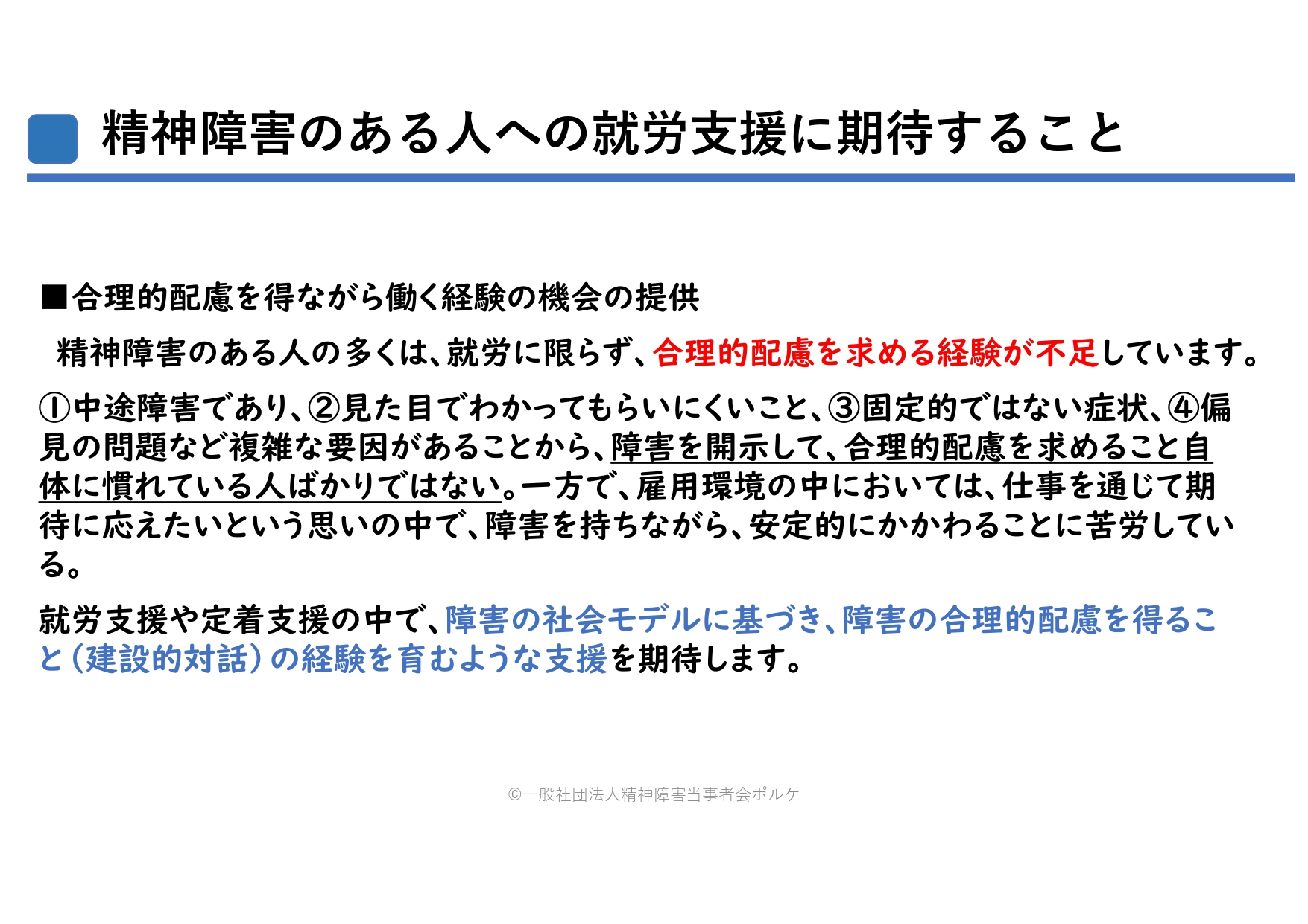 当会では今年度、精神障害のある人の就労に関する合理的配慮の実態調査に取り組んでおり、当日のディスカッションでは他の委員の皆様から、今後の調査項目や視点に関する貴重なご意見やアイデアをいただくことができました。引き続き当事者の声に基づいた調査と提言を重ねたアクションを深めていきたいと思います。