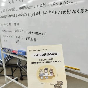 2025年11月12日(水)高知市障害者福祉センターにて「ふだんからの防災 ―精神障害のある人の経験から学びあおう―」を開催しました。当日は約20名の方にご参加いただき、視覚障害のある方、車椅子ユーザー、精神障害のある当事者、ご家族、支援者、行政の方など、多様な立場の方々が集まりました。
