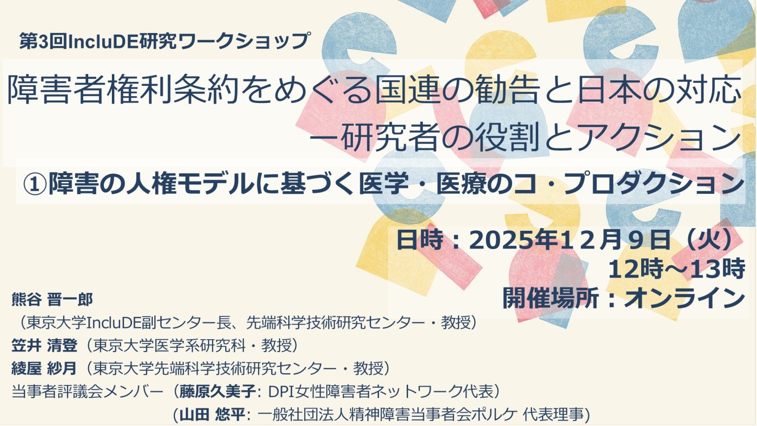 【情報提供】12.9 第3回IncluDE研究ワークショップー障害者権利条約をめぐる国連の勧告と日本の対応 ― 研究者の役割とアクション