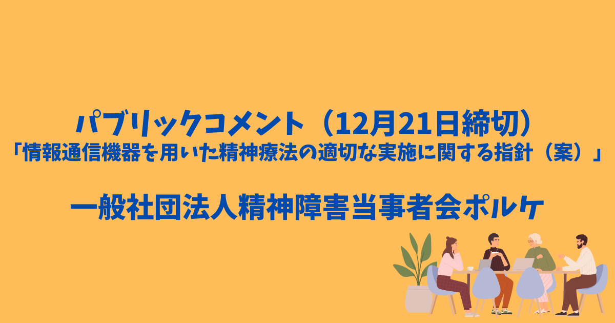 一般社団法人精神障害当事者会ポルケではこれまで、加盟団体の全国「精神病」者集団を通じて、代表理事の山田悠平が「情報通信機器を用いた精神療法を安全・適切に実施するための指針」の検討に関わる委員を務めたほか、日本精神神経学会の企画等でも、普及に向けた課題提起や提言を継続して行ってきました。
