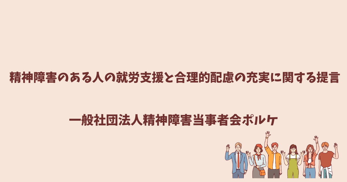 一般社団法人精神障害当事者会ポルケは、2026年3月16日「精神障害のある人の就労支援と合理的配慮の充実に関する提言」を厚生労働大臣および厚生労働省関係部局に提出しました。本提言は、当会が令和7年度に実施した「精神障害のある人の就労経験における合理的配慮に関する意識調査」等で把握した当事者の経験や課題認識をもとに、近年の障害者就労施策の見直し、関係指針や制度の動向、さらに国連障害者権利委員会による日本への総括所見も踏まえて取りまとめたものです。