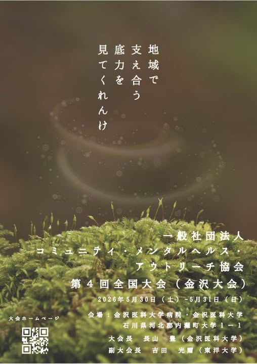 一般社団法人コミュニティ・メンタルヘルス・アウトリーチ協会(アウトリーチネット)が、2026年5月30日(土)・31日(日)に、金沢医科大学にて第4回全国大会(金沢大会)を開催します。大会テーマは「地域で支え合う底力を見てくれんけ!」だそうです。対面開催を基本とし、一部は後日オンデマンド配信も予定されています。対象は、専門職、当事者、家族、学生、一般市民など幅広く設定されています。自主企画のプログラムで当会の取り組みから話題提供もあります。どうぞ奮ってご参加ください。