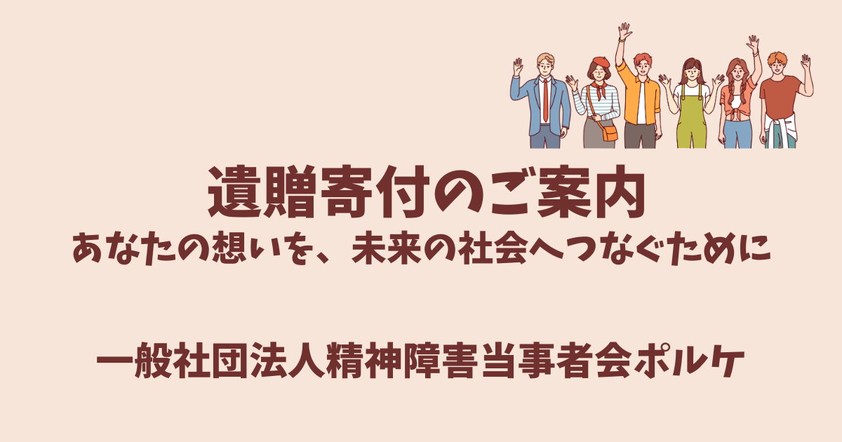 一般社団法人精神障害当事者会ポルケでは、当事者の交流の場づくりや、調査活動、学習会の開催など関係団体と連携しながら国連障害者権利条約の実施を活動の柱として、当事者の権利擁護、共生社会づくり寄与に向けた取り組みを行っています。当事者によるピアサポートや啓発活動、調査研究、災害時支援、国際交流など、多様な取り組みを行っています。この活動を未来へと引き継ぐために、遺言による「遺贈寄付」を受け付けています。