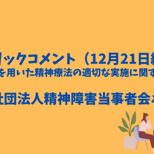 2025年12月17日 / 最終更新日時 : 2025年12月17日 精神障害当事者会ポルケ イベント案内・情報提供 【情報提供】注目!パブリックコメント「情報通信機器を用いた精神療法の適切な実施に関する指針(案)」(締切:12月21日) 一般社団法人精神障害当事者会ポルケではこれまで、加盟団体の全国「精神病」者集団を通じて、代表理事の山田悠平が「情報通信機器を用いた精神療法を安全・適切に実施するための指針」の検討に関わる委員を務めたほか、日本精神神経学会 […]